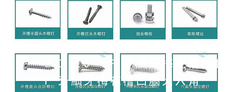 1.機螺釘 2.自攻螺釘 3.鉆尾螺釘 4.墻板釘 5.纖維板釘 6.木螺釘7.六角木螺釘 8.不脫出螺釘 9.組合螺釘 10.微型螺釘 11.家具螺釘 12.電子螺釘頭型:1.六角頭(hexagon head) 2.六角頭法蘭面(hexagon head with flange) 3.